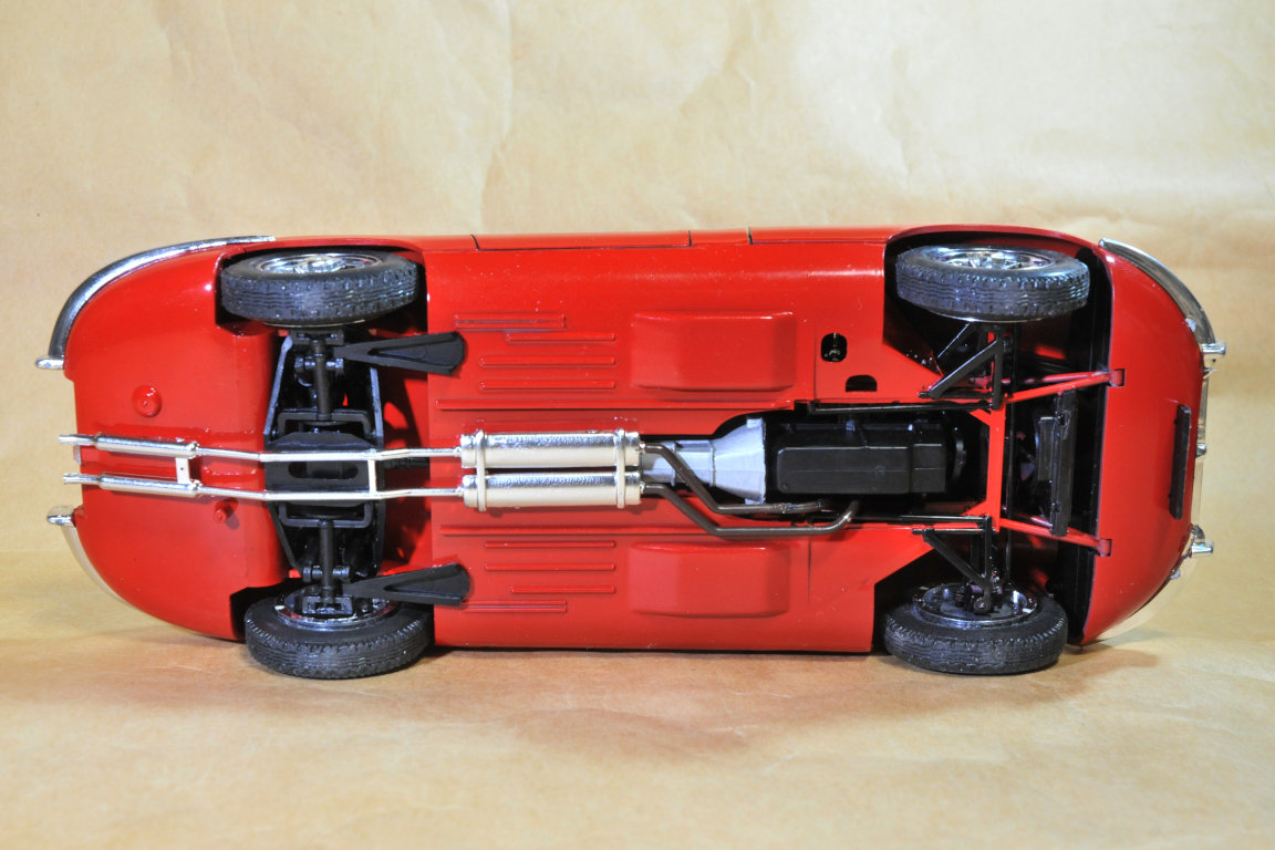 ワイヤースポークホイール、キットのものはワイヤーに見えないのでハセガワ製フェラーリ250TRのものに入れ替え。なので接着固定で回転しません。前輪ステアは可能
